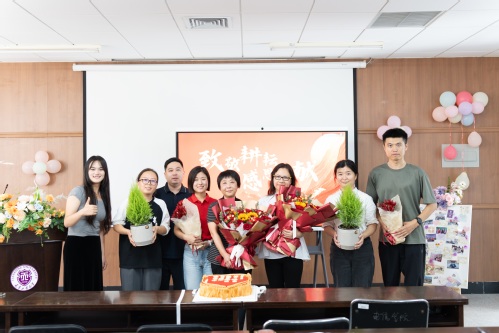 “两位老师的坚守,是我们青年教师的榜样。”青年教师代表手捧鲜花与青松绿植走上台,翠绿的青松象征“教坛长青”,与花束相映成趣。青年教师杨树昌动情说道:“以后我们会带着这份传承,把育人的事做细做实。”仪式最后,全体教师与两位老师在学院“芯光大道”上合影。镜头里,黄洁老师和陈伏荣老师的笑容里满是欣慰与期许。