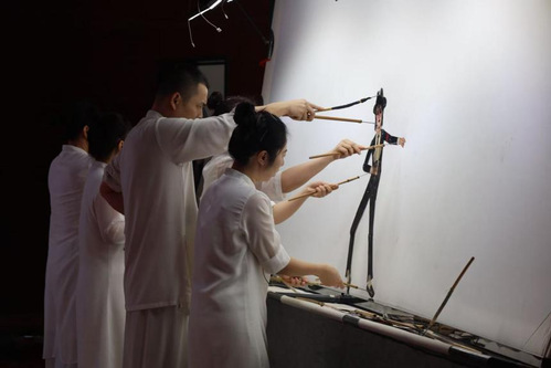 展演结束后,充满趣味的学生互动环节随即展开。在华州皮影团成员的指导下,同学们有序上台,亲手操控皮影道具,尝试编排简单的皮影动作。学生们在实践中感受皮影操控的独特技巧,现场欢笑声与讨论声不断,进一步拉近了青年一代与传统非遗文化的距离。