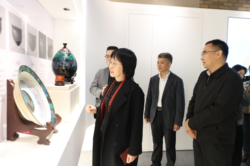 在中华器物艺术高等研究中心,郑氏漆器制作技艺项目传承人、艺术学院教授郑勇介绍了中心及项目的建设情况,朱宝霞一行现场观摩了漆器作品展、津派华氏刻瓷展、玻璃艺术展,并听取了团队关于漆器制作技艺特点、文化内涵、传承创新、育人成效等方面的汇报。