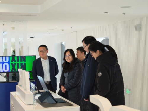 在参观产业园内联想未来中心的过程中,学院教师代表们通过沉浸式的数字交互体验,深入了解了前沿科技与先进制造理念的深度融合,切身感受到人工智能对战略性新兴产业和未来产业的强劲赋能。学院教师代表重点参观了联想天津工厂的自动化产线,该产线融合物联网、数字孪生、5G及智能算法,实现了“每9秒下线一台电脑”的智造效率。同时,工厂通过覆盖3万平方米的太阳能光伏板,年发电量超500万度,展示了绿色科技与先进制造的深度融合。